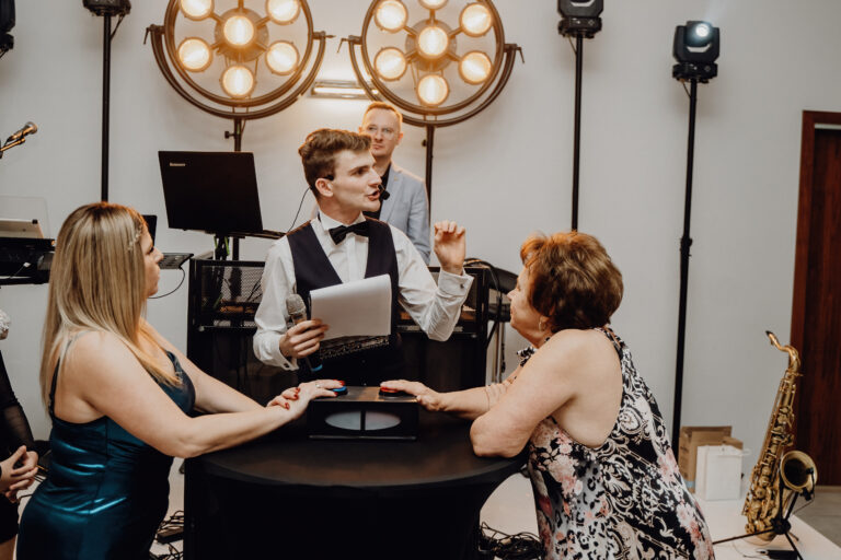 Profesjonalny DJ to gwarancja doskonałej zabawy i muzyki, która poruszy wszystkich gości. Dzięki doświadczeniu i intuicji potrafi idealnie dopasować repertuar do charakteru wydarzenia – od eleganckich przyjęć po pełne energii wesela. Każdy set jest starannie przygotowany, ale też elastyczny, by reagować na nastrój gości i atmosferę na parkiecie. DJ łączy nowoczesne brzmienia z ponadczasowymi hitami, tworząc spójną, dynamiczną całość. Jego zadaniem jest nie tylko puszczenie muzyki, ale zbudowanie klimatu, w którym każdy gość poczuje się częścią wspólnej zabawy. Współpraca z wokalistą i instrumentalistami (saksofon, skrzypce) pozwala tworzyć wyjątkowe muzyczne momenty — pełne emocji, rytmu i klasy.